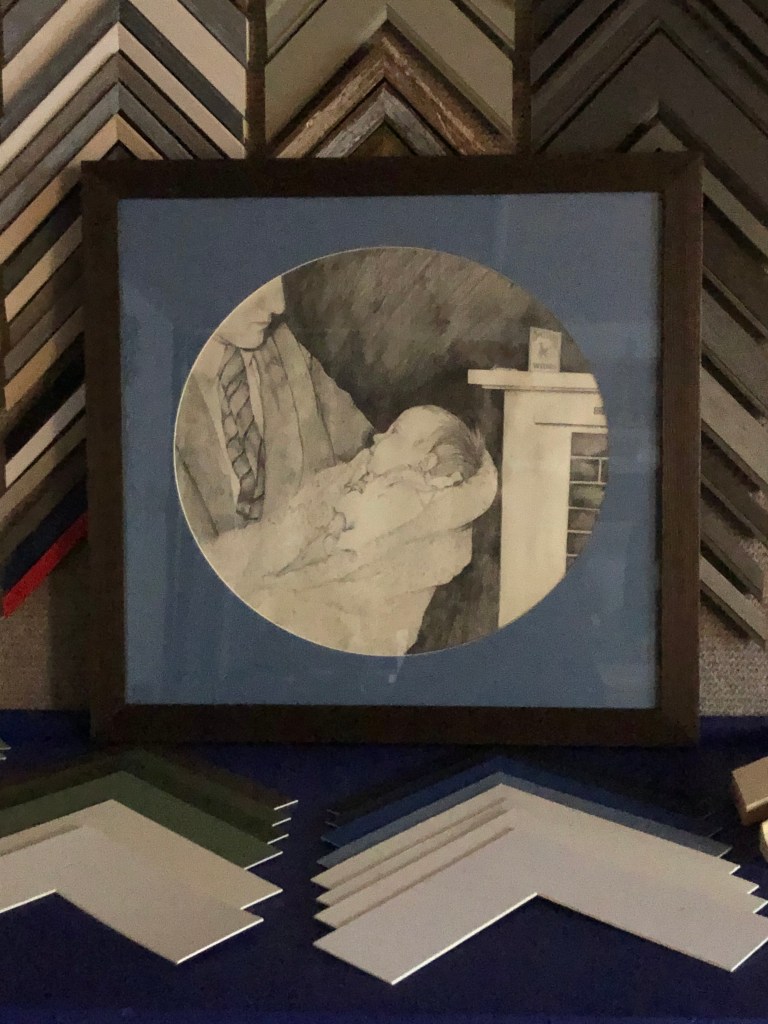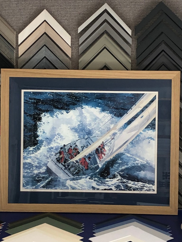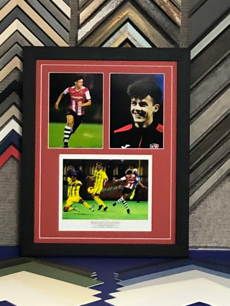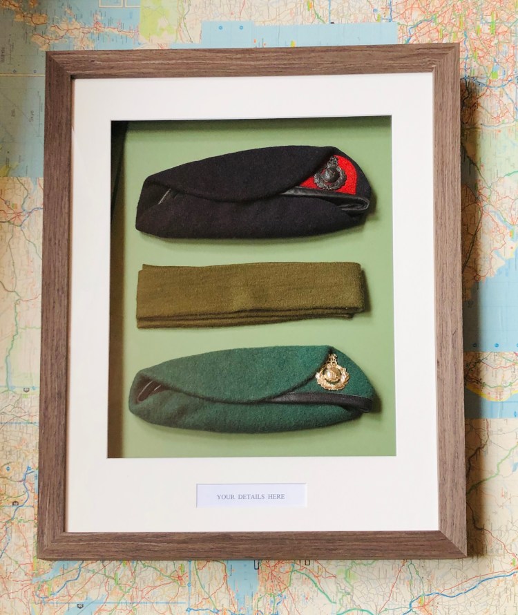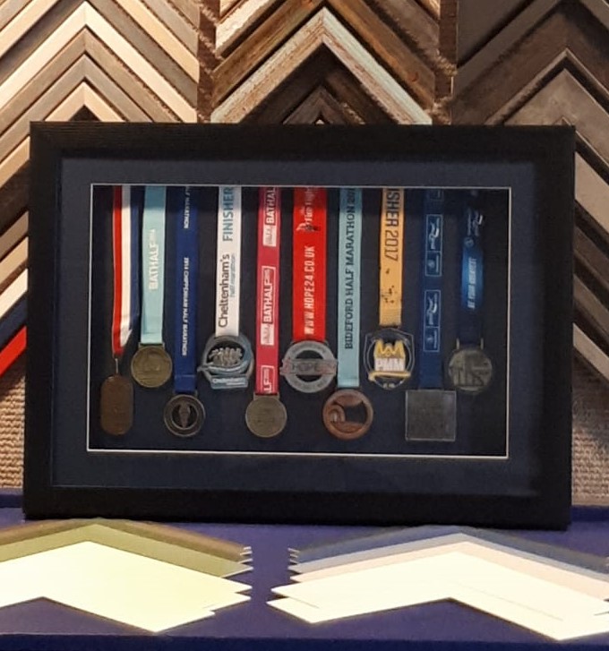 Bespoke frames and text, made in houseOriginal artwork framed Stages of Royal Marine Commando trainingFramed family historyMemento of first appearance for local football teamBeautiful pencil drawing from the 1970sLarge frame for a scratch off map of the United KingdomLocal artist’s work framed by a local businessThe first of many frames to display the medals from completed races